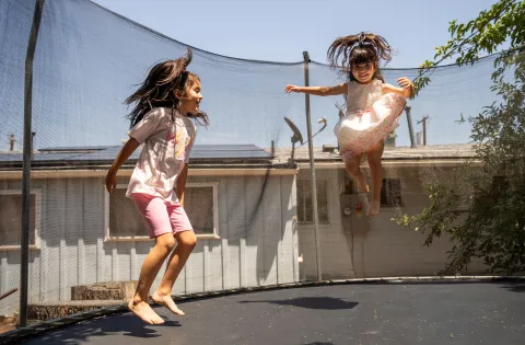 Two girls hugging on a trampoline